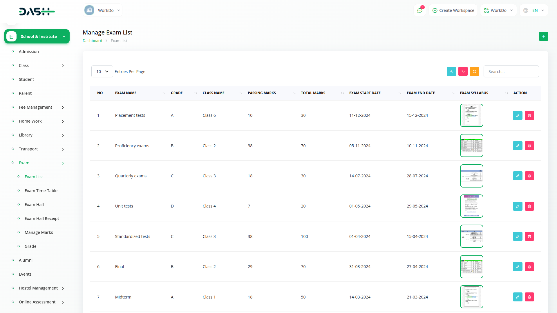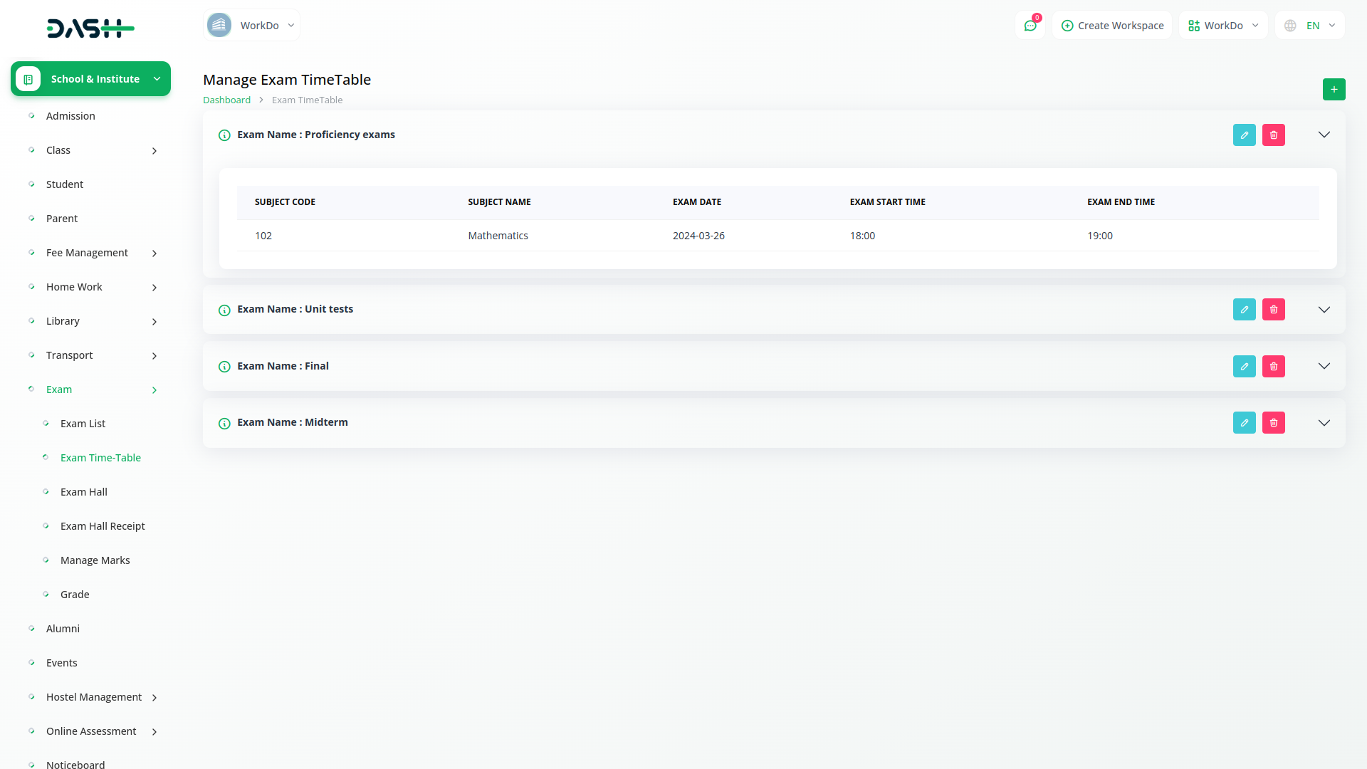 Dash SaaS`s Exam Module simplifies the creation and management of exam lists, allowing administrators to easily schedule exams for different courses, classes, or academic programs. Whether it`s setting exam types, durations, or other details, this module offers flexibility and customization options to meet the unique needs of each institution. With just a few clicks, administrators can create comprehensive exam schedules tailored to their specific requirements.