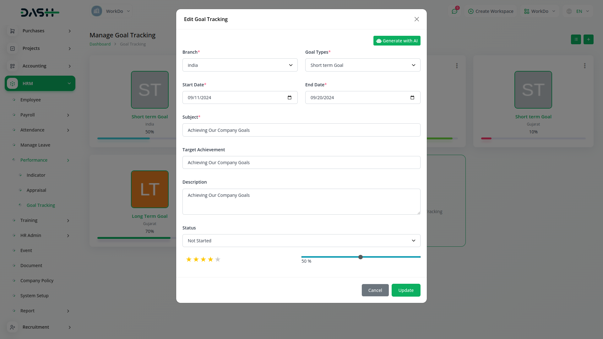 Boost employee productivity with custom KPIs. Track employee performance, share feedback, and help them reach company targets. Depending on Hrm Module.
